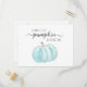 A cute baby boy shower invitation postcard featuring "A Sweet Little Pumpkin Is On His Way" written in modern typography and stylish script with swashes, and a pastel blue watercolor of a pumpkin. On the back, personalize the mother's name and shower details in simple typography.