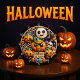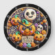 This cheerful Halloween illustration is designed in a playful, three-dimensional style. It features a group of smiling pumpkins, a happy ghost-moon, and tiny bats. The scene is filled with vibrant details like spiderwebs, colorful flowers, and berries. A sign reading 'SPOOKY SEASON' completes this adorable and festive design.