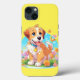 A iPhone 13 Case with a picture of a cute puppy sitting amongst the flowers. He looks very happy to be surrounded by flowers and butterflies.The perfect gift to give those who love puppy dogs. Contains generative content.
