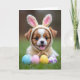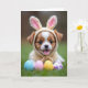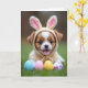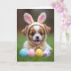 Designed with a sweet spring scene, the card features a small puppy wearing a pale hooded outfit with tall bunny ears lined in soft pink 🐰. The puppy’s large dark eyes and tiny tongue create a gentle, friendly look, like it’s leaning in to share a quiet joke with you. It rests on bright green grass, with the background softly out of focus to keep attention on the face and fuzzy textures. In the lower foreground sit four smooth eggs in pastel tones—sky blue, blush pink, butter yellow, and white—arranged close together like a little group huddle. The white egg includes small purple bow-like decorations that add a tender, gift-like touch 🌷. Easter greeting text sits near the top in a light, springy color, with a smaller line placed beneath it in a slightly darker shade for contrast. Soft daylight highlights the pink ear lining, the puppy’s whiskers, and the glossy sheen on the eggs.