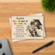 Ordering and customizing was easy! Shipping was FAST. It arrived in 6 days; 5 days sooner than expected! My photo doesn’t do it justice. The quality is of image is clean & clear. I went with thin plexi so it would fit block holder (I bought elsewhere) without standing completely upright. Highly recommend!!!