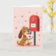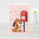 This cute Valentine’s Day greeting card features an adorable cartoon puppy in warm brown tones, sitting with its body slightly turned and looking straight at you. The puppy has floppy ears, big shiny eyes, and a wide happy smile, with a bright red collar around its neck. Held in its paws is a white envelope marked with a red heart, as if it’s ready to deliver a loving note ❤️💌. To the right, a classic red mailbox holds a white card peeking out, also stamped with a red heart. The background is a soft blush pink with small red hearts floating upward, adding to the romantic mood. There is no text on the front, letting the artwork tell the story. It’s a warm, caring card that’s perfect for sharing Valentine’s Day feelings with someone special