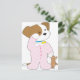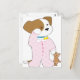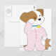 A cute, sleepy puppy still wearing its collar, is ready for bedtime dressed in pajamas and with a teddy bear in hand.