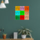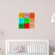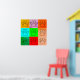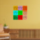 Wall art with acute pattern of black dog paw prints in squares of different colors.
