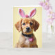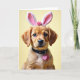 This card features a close-up portrait of a young dog set against a soft, sunlit yellow background, with a gentle, friendly look that feels like a quiet invitation to come closer 🌷. The dog’s golden-brown fur is shaded to look plush and touchable, and its dark, glossy eyes seem to meet yours with the kind of tender attention you’d share with a favorite companion. Perched on its head are upright bunny ears in pale pink and white, topped with a small blush-colored rosebud that adds a sweet, affectionate touch 🐰. Around its neck sits a slim black collar with a layered charm that looks like a little love token. The charm shows a solid pink heart overlapping a round disc in deep red with small white polka dots, giving the outfit a cute, date-night feel without being over the top. Any wording appears small and centered near the top in a soft pink tone that matches the heart, leaving the portrait to do most of the talking. The lighting is diffused, highlighting the soft coat texture and the moist shine on the dog’s dark nose.