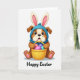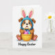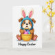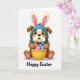 This card shows a young, dog-like character standing against a bright white background, dressed in a soft sky-blue hooded cape with tall cream ears tipped in rosy pink 🐰. Big dark eyes look forward with a gentle, almost shy curiosity, and the slightly open mouth hints at a small smile meant for someone special. Its little brown paws hold a warm golden basket close to its chest, as if offering it to a dear friend. Inside the basket sit egg-shaped treats in pastel lilac, pink, and pale blue, with a few lightly speckled details for texture 🌷. Soft, diffused lighting adds faint shadows under the character and basket, giving the rounded shapes a plush look. A short holiday greeting sits beneath the illustration in a flowing dark gray line of text, centered near the bottom edge. The ears rise above the hood in two tall arcs, with the pink inner shading fading softly toward the tips.