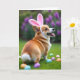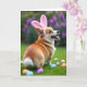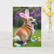 Designed with a cozy springtime look, this card features a short-legged dog with fluffy golden-red and creamy white fur wearing oversized pink ear coverings that frame its face like a festive accessory 🐰. The pup is turned slightly away, yet its bright eyes glance up to the right, and its open mouth with a small tongue showing gives it an eager, friendly expression, like it’s watching someone it adores. It stands on a rich green lawn under soft daylight, with the grass looking freshly kept and inviting. Scattered across the foreground and mid-ground are smooth egg-shaped decorations in purple, blue, orange, and pale green, adding pops of color that feel like a shared spring surprise 🌷. Behind the dog, a softly blurred band of deep purple flowers creates a calm backdrop that makes the warm fur tones stand out. The main greeting text sits near the top in a gentle pastel shade, with a smaller line of text placed near the bottom in a matching color for balance. In the distance, the purple blossoms fade into a painterly haze above the bright lawn and scattered eggs.