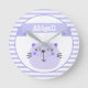 NewParkLane - Personalized clock, with a template for your name in a lilac banner, and a cute cat in different shades of purple. In the background a sweet lavender and white striped pattern. A cute design for a nursery or kids' room!