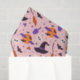 This design showcases a whimsical and vibrant Halloween pattern with a playful color scheme. The design features a soft pink background, adorned with an array of classic Halloween icons. Among them are witch hats, cauldrons bubbling with potions, flying bats, skulls, broomsticks, and bottles of potion. There are also elements like mushrooms, stars, crescent moons, and clouds, all rendered in a palette of rich purples, oranges, and blacks. The overall effect is a fun and festive pattern that captures the spooky yet lighthearted spirit of Halloween, perfect for decorations, costumes, or party supplies.