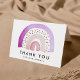Modern rainbow thank you cards featuring a watercolor rainbow on the front in shades of purple, blush, and pink with "Thank You" displayed below in black lettering. Personalize the rainbow thank you card by adding your name or custom text. The inside of the card is blank with plenty of space for your typed or handwritten thank you message. The back of the folded thank you card features a matching rainbow pattern. The watercolor rainbow thank you card is perfect to use for baby showers, birthday parties, and more!