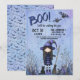 The design features a sweet little witch in purple stripes with her black cat and friendly bats flying above. A whimsical blue and purple background with stars sets the scene for a fun and festive afternoon. Perfect for children’s costume parties.