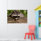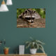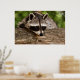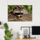 A poster with a photograph of a cute and curious raccoon resting his face on a wooden log. Adorable.