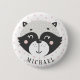 NewParkLane - Name Button, with a cute black and white racoon in watercolor, against a fun abstract patterned blush and white background.