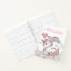 This enchanting custom notebook features a magical unicorn theme. A cute unicorn with pink hair and a gold glitter horn is placed in the center, above a bouquet of pastel colored roses. A pretty rainbow and matching hearts is printed behind the unicorn. A sample name is printed at the top in a whimsical pink font which you can personalize to include your own name or custom text.