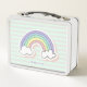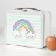 NewParkLane - Personalized Kids Lunch Box with a cute rainbow, against a mint green striped background, and a text template for your child's name.