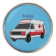 This happy red ambulance is on the way to help! Drawn in fun cartoon style.