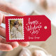 Cute Valentine's day gift tags featuring your vertical photo inside of a white postage stamp frame. The phrase "Happy Valentine's Day" is displayed in whimsical, white hand-lettering surrounded by light pink hearts. Personalize the front of the photo Valentine's Day gift tag with your name in white lettering on a red background. The gift tag reverses to display a red and pink heart pattern.