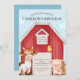 This custom party invitation features a cute, watercolor style farm theme. An image of a big red barn is placed in the background, with cute farm animals standing in front. To the right is a baby pig, and to the left is a baby cow. A little chick is perched on the doorway.