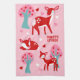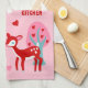 Create an extra sweet gift for your valentine. This kitchen towel has illustrations of cute red and white deer with white heart-shaped spots and pink heart-shaped notes along with pretty trees and hearts against a pink background. This towel is ready to be personalized with a name or your own custom message in red letters.