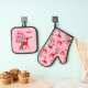 Show a special someone some love with this adorable Valentine's Day themed potholder and oven mitt set. The square potholder features an illustration of a cute red deer and a pretty pink and blue tree set against a light pink background. The potholder is ready to be personalized with a name in red lettering. The coordinating oven mitt has an all over pattern of cute deer and pretty trees.