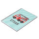 A notebook with a cute red fire truck that has white stripes on its side and a retractable ladder with hose. Slanted blue stripes forbackground. Colour palette of red, blue, grey and white. Personalise with child's name. Encourage the little ones to write and doodle in this notebook, especially boys, who love vehicle toys and fire engines!