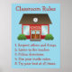 Personalizable classroom rules poster featuring a cute cartoon illustration of a red and white school building with brown roof. Personalize the text to create custom classroom rules.