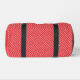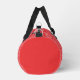 NewParkLane - Cute personalized Duffle Bag featuring a pattern of little white diagonal polkadots against a bright red background with a round frame for your name and monogram. Easy to customize in Zazzle with your own text for a personalized design.
