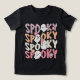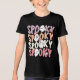 Cute Repeat Spooky Girly Halloween Ghost Typography Girls Tshirt features the text "Spooky" in modern purple, orange, white and pink repeat script typography accented a cute ghosts and flowers. Perfect for Halloween parties. Designed by Evco Holidays www.zazzle.com/store/evcoholidays