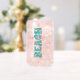 Our ‘Beach Life’ Can Glass is a perfect blend of style and functionality. This glass, shaped and sized like a beer or soda can, brings a unique twist to your drinkware collection. The highlight of this glass is the whimsical ‘Beach’ text, artistically rendered in pastel shades of aqua blue, pink, and yellow. The text is not just a word but a canvas for adorable beach-themed images. The images of cute palm trees, hibiscus flowers, seashells, a beach chair, and a beach umbrella are intricately incorporated into the ‘Beach’ text itself, creating a delightful visual treat.