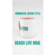 Step back in time with this whimsical 1970s retro-style ceramic coffee mug. Adorned with pastel shades of aqua blue, pink, and yellow, this mug is sure to help you embrace the beach life. The mug features colorful ‘Beach’ text, intricately designed with images of cute palm trees, hibiscus flowers, seashells, a beach umbrella, and beach chair. Adding a touch of elegance is the word ‘life’ in pretty pink script text, nestled comfortably below the word ‘beach’. Exuding a feminine boho vibe, this mug is the perfect addition to a tropical beach home or a bed and breakfast rental. It’s also an ideal gift for anyone who loves the beach or tropics. Whether you’re sipping your morning coffee or unwinding with a hot cup of tea, this mug will transport you to a beachy paradise.