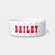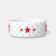 Create your own custom, personalized, bold christmas red rustic vintage western script / typography custom name at front and back, with three stars in the middle and light blue retro style polka dots in the background, ceramic, pet dog cat doggy puppy kitten food bowl. Simply enter your pet's name / your text, to customize. Great for birthday, christmas, holidays, new years, and more, for pet dog / cat owners, friends, and family.
