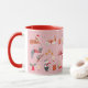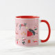 Cute retro Christmas illustration with cats around the Christmas tree, looking presents, all-over print pattern on pink background. Original artwork by Caroline Bonne Müller