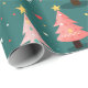 Fun colors decorate cute little Christmas trees that parade over this light-hearted wrapping paper. A dark teal blue green background rests behind the colorful festive trees in pink, light blue, and with yellow stars and multicolored baubles. These are from a retro watercolor pattern.