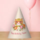 These cute girls' birthday party hats feature a hand drawn retro cat wearing sunglasses, along with floral elements (including daisies) and star accents. A color palette of pink, orange, muted gold, and olive toned greens adds to the retro / vintage look! A text template is included for easy personalization. *Illustration by Tracey Khalei / Orabella Prints.