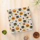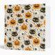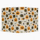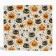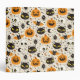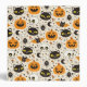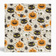 This design presents a cute and whimsical Halloween pattern filled with a delightful assortment of classic spooky icons. The background is a light cream color, providing a soft contrast to the bold designs. The pattern includes playful jack-o'-lanterns with different expressions, black cats with bright yellow eyes, smiling skulls, and friendly bats with orange wings. Scattered throughout are spiders, crescent moons, stars, mushrooms, and magical symbols, all adding to the enchanting Halloween atmosphere. The color palette features striking blacks, oranges, and yellows, creating a lively and festive design perfect for Halloween decorations, clothing, or party themes. The overall feel is fun and charming, ideal for celebrating the spooky season with a touch of sweetness.