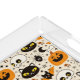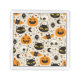 This design presents a cute and whimsical Halloween pattern filled with a delightful assortment of classic spooky icons. The background is a light cream color, providing a soft contrast to the bold designs. The pattern includes playful jack-o'-lanterns with different expressions, black cats with bright yellow eyes, smiling skulls, and friendly bats with orange wings. Scattered throughout are spiders, crescent moons, stars, mushrooms, and magical symbols, all adding to the enchanting Halloween atmosphere. The color palette features striking blacks, oranges, and yellows, creating a lively and festive design perfect for Halloween decorations, clothing, or party themes. The overall feel is fun and charming, ideal for celebrating the spooky season with a touch of sweetness.