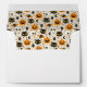 This design presents a cute and whimsical Halloween pattern filled with a delightful assortment of classic spooky icons. The background is a light cream color, providing a soft contrast to the bold designs. The pattern includes playful jack-o'-lanterns with different expressions, black cats with bright yellow eyes, smiling skulls, and friendly bats with orange wings. Scattered throughout are spiders, crescent moons, stars, mushrooms, and magical symbols, all adding to the enchanting Halloween atmosphere. The color palette features striking blacks, oranges, and yellows, creating a lively and festive design perfect for Halloween decorations, clothing, or party themes. The overall feel is fun and charming, ideal for celebrating the spooky season with a touch of sweetness.