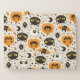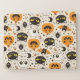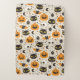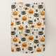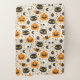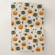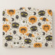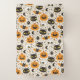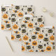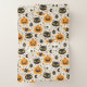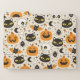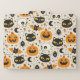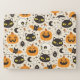 This design presents a cute and whimsical Halloween pattern filled with a delightful assortment of classic spooky icons. The background is a light cream color, providing a soft contrast to the bold designs. The pattern includes playful jack-o'-lanterns with different expressions, black cats with bright yellow eyes, smiling skulls, and friendly bats with orange wings. Scattered throughout are spiders, crescent moons, stars, mushrooms, and magical symbols, all adding to the enchanting Halloween atmosphere. The color palette features striking blacks, oranges, and yellows, creating a lively and festive design perfect for Halloween decorations, clothing, or party themes. The overall feel is fun and charming, ideal for celebrating the spooky season with a touch of sweetness.