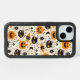 This design presents a cute and whimsical Halloween pattern filled with a delightful assortment of classic spooky icons. The background is a light cream color, providing a soft contrast to the bold designs. The pattern includes playful jack-o'-lanterns with different expressions, black cats with bright yellow eyes, smiling skulls, and friendly bats with orange wings. Scattered throughout are spiders, crescent moons, stars, mushrooms, and magical symbols, all adding to the enchanting Halloween atmosphere. The color palette features striking blacks, oranges, and yellows, creating a lively and festive design perfect for Halloween decorations, clothing, or party themes. The overall feel is fun and charming, ideal for celebrating the spooky season with a touch of sweetness.