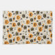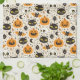 This design presents a cute and whimsical Halloween pattern filled with a delightful assortment of classic spooky icons. The background is a light cream color, providing a soft contrast to the bold designs. The pattern includes playful jack-o'-lanterns with different expressions, black cats with bright yellow eyes, smiling skulls, and friendly bats with orange wings. Scattered throughout are spiders, crescent moons, stars, mushrooms, and magical symbols, all adding to the enchanting Halloween atmosphere. The color palette features striking blacks, oranges, and yellows, creating a lively and festive design perfect for Halloween decorations, clothing, or party themes. The overall feel is fun and charming, ideal for celebrating the spooky season with a touch of sweetness.