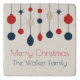 Cute retro Merry Christmas trivet with vintage 70 style ornaments in red, blue, and ivory above your family name. Beautiful nostalgic holiday kitchen decor gift for your home.