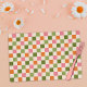 This fun placemat is designed with a retro checkerboard design in pink, orange, olive toned greens, and cream. Simple and cute for any purpose, whether for a kids' party or everyday use! *Pattern by Tracey Khalei / Orabella Prints.