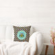 Cute retro look pillow for kids has green and brown owl and daisy wreath center graphic with brown and blue flower pattern background