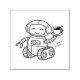 Black and white cartoon illustration of a cute futuristic robot rolling fast while holding a cup of coffee.