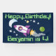 Explore space on your child's special day with this cute design featuring a boy in a rocket ship drawn in fun cartoon illustration style!
