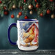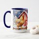 Cute Christmas rooster themed coffee mug with a watercolor style chicken standing by a rustic wood fence in front of a barn.