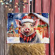 Cute Christmas pig in a Santa hat themed holiday gift bag with a watercolor style hog standing in front of a barn on a snowy winter day.