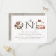 As the leaves begin to fall, invite your loved ones to hop on over to your child's special day! A modern, gender neutral first birthday party invitation featuring a deer, raccoon, bunny rabbit, fox, squirrel and owl surrounding "ONE" in a whimsical, rustic typography. Perfect for a cute forest themed birthday party! These cards reverse to a country wood graphic. Edit the text in the template boxes to customize these cards. Your friends and family will be delighted to receive these charming autumnal invites!