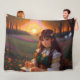 Cute Sad Anime Style Woman in Meadow at Sunset Fleece Blanket