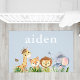Cute light blue rug for your baby boy's nursery featuring watercolors of baby safari animals (giraffe, tiger, lion and elephant) and his name in white typography. You can adjust the size of the text for longer or shorter names by editing in the design tool.